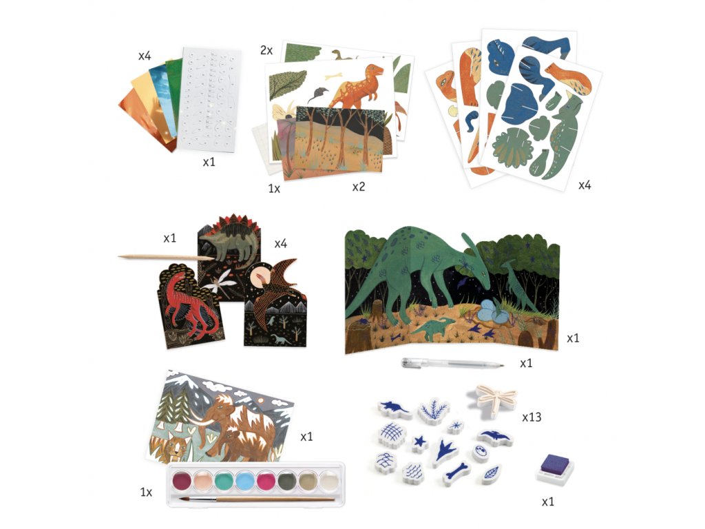 Zbierka 6 kreatívnych aktivít na tému dinosaurov. Veľká kreatívna sada – zbierka 6 kreatívnych činností, ktoré spája téma dinosaurov. Poskladáš si kartónových 3D dinosaurov, trojdielny roztvárací obraz zaplníš pečiatkami a kresbami, zhotovíš si dve 3D koláže, vzormi doplníš 4 vyškrabovacie obrázky a dotvoríš ďalšie dva obrázky – jeden farebnými fóliami a druhý vodovými farbami. Tvorivá zábava na niekoľko hodín. Sada obsahuje všetko potrebné.Koláže, vyškrabávanie, pečiatky, 3D dinosaury a mnoho iného. Obsah: 4x hárok s časťami na poskladanie kartónových dinosaurov, 1x trojdielny roztvárací obraz, 13x pečiatky, 1x poduška na pečiatky, 1x pero, 4x vyškrabovacie obrázky, 1x drevená škrabka, 2x obrázok na koláž, 2x hárok s prvkami na koláž, 1x obrázok na dofarbenie vodovkami, 1x vodové farby, 1x štetec, 1x obrázok na dotvorenie farebnými fóliami, 4x hárok farebných fólií, 1x hárok s obojstranne lepiacimi lepkami, 2x hárok s obojstranne lepiacimi štvorčekmi.Dodatočné parametre