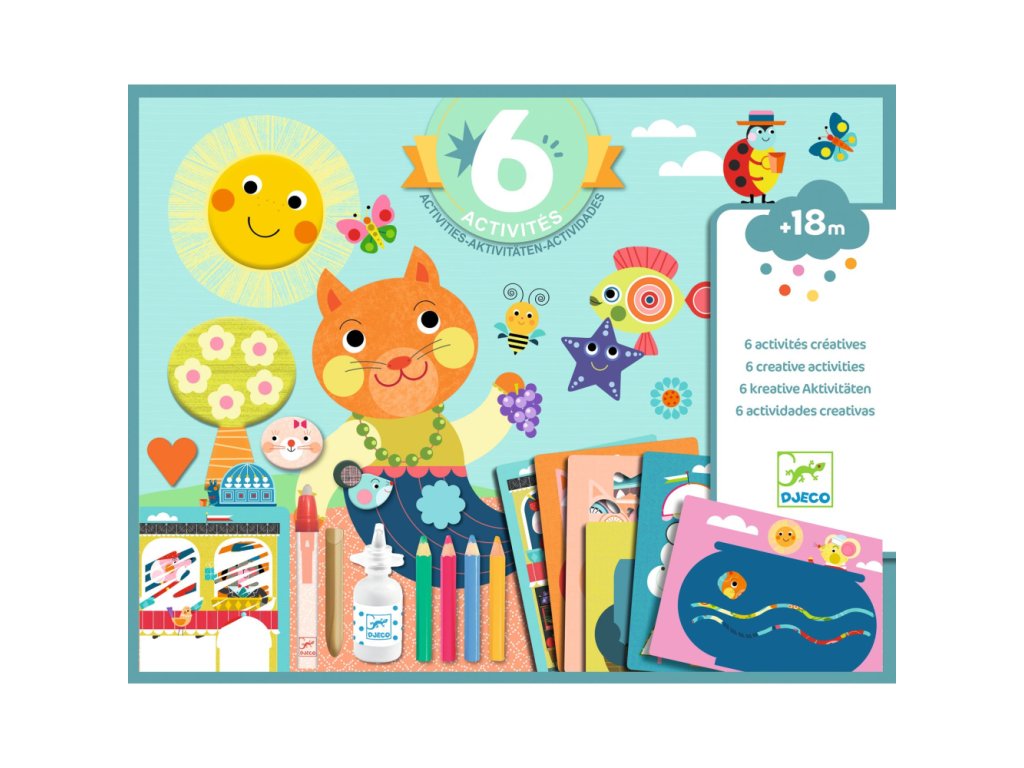 Veľká kreatívna sada Mačka a jej priatelia Tvorivé dielne pre najmenších Tento kreatívny set ponúka 6 zábavných a edukačných aktivít pre deti od 18 mesiacov, ktoré pomáhajú rozvíjať kreativitu, zručnosť a manipuláciu. V sade nájdete koláž, magické vyfarbovanie vodou, vyškrabovacie obrázky a ďalšie tvorivé techniky, ktoré deti môžu vykonávať podľa vlastného tempa. Set je navrhnutý pre začiatočníkov a obsahuje všetky potrebné materiály, ako sú plstené dieliky, farebné ceruzky, štetce a ďalšie príslušenstvo, aby deti mohli okamžite začať tvoriť.Obsah balenia• klasická koláž: 1 ilustrovaná karta, 1 vopred narezaná doska z hrubej lepenky a 1 tuba lepidla• mlstená koláž: 12 dosiek na dekoráciu a 4 hárky samolepiacich plstených dielikov• myfarbovanie so šablónou: 4 ilustrované listy, 1 šablóna a 4 farebné ceruzky• magické vyfarbovanie vodou: 1 kartička s bielou vrstvou na opakované vyfarbenie a 1 štetec s filcovým hrotom a nádržkou na vodu• magické vyfarbovanie farbičkami: 3 karty na vyfarbenie s magickým povlakom• vyškrabovacie obrázky: 3 karty a 1 drevená škrabka na vyškrabovanie• 1 obrázkový návod krok za krokom.Dodatočné parametre