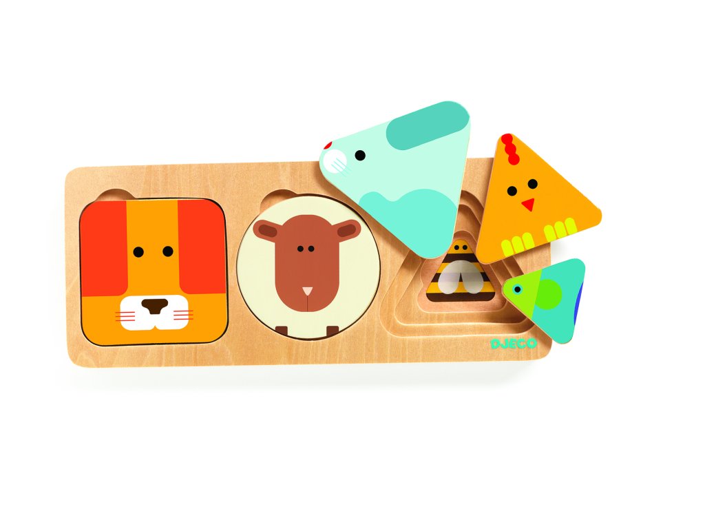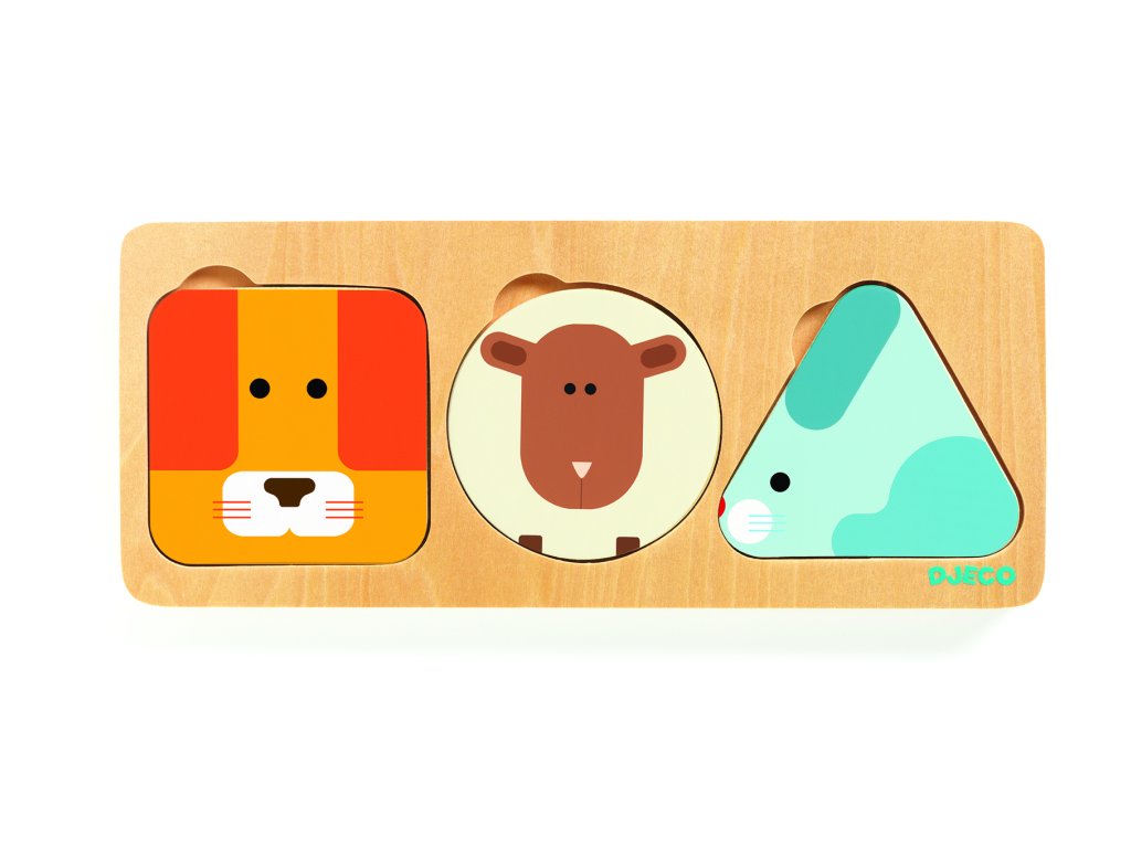 Vkladacie puzzle Zvieratá Drevené 3-vrstvové mini puzzle pozostáva z vkladacej podložky a 9 dielikov Dieliky v tvare štvorca, kruhu a trojuholníka sa vyznačujú geometrickou kresbou znázorňujúcou zvieratko. Výhoda takéhoto stvárnenia spočíva v tom, že je zábavné hádať, aké zvieratká sú na dielikoch znázornené.Zároveň sa tak vizuálne prepája matematika s prírodou Úlohou dieťaťa je vkladať do dosky jednotlivé dieliky, logicky ich vrstviť podľa tvaru a veľkosti. Hračka patrí do produktovej série Basic, ktorá je určená pre prvé vzdelávacie úlohy. Vyznačuje sa minimalistickým dizajnom a jemnými farbami v kombinácii s prírodnou farbou dreva. Podporuje spoznávanie tvarov, farieb, utváranie matematických predstáv, rozvoj jemnej motoriky a logického myslenia.Odporúčaný vek: 12m+Dodatočné parametre