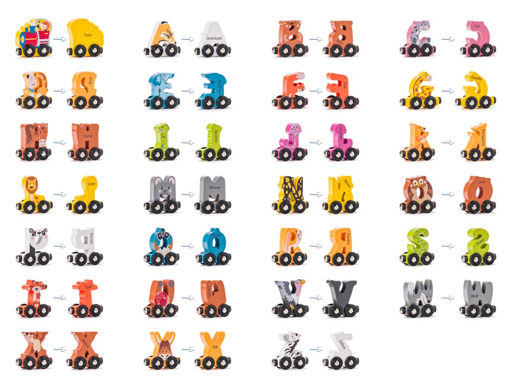 Tento barevný dřevěný vláček s abecedou potěší všechny malé objevitele písmenek i zvířat. Sada obsahuje 27 dílů – lokomotivu a vagonky ve tvaru písmen, které jsou spojeny klasickými magnety. Každé písmeno má podobu zvířátka a na druhé straně jeho anglický název, takže si děti při hře nenápadně osvojují základy angličtiny. Děti si navíc mohou hravě skládat jednotlivá písmena do slov, rozvíjet tak svou kreativitu a učit se číst. Abeceda je krásně barevná, hravá a originální – její jedinečný design pochází od české autorky. Ideální hračka pro rozvoj fantazie, jemné motoriky i jazykových dovedností. Rozměry jednoho vagonku cca: 6,3 x 6,5 x 2,5 cm. Celková délka vláčku: 179 cm. Rozměry balení: 32 x 47 x 37,5 cm. Věk: 3+Dodatočné parametre