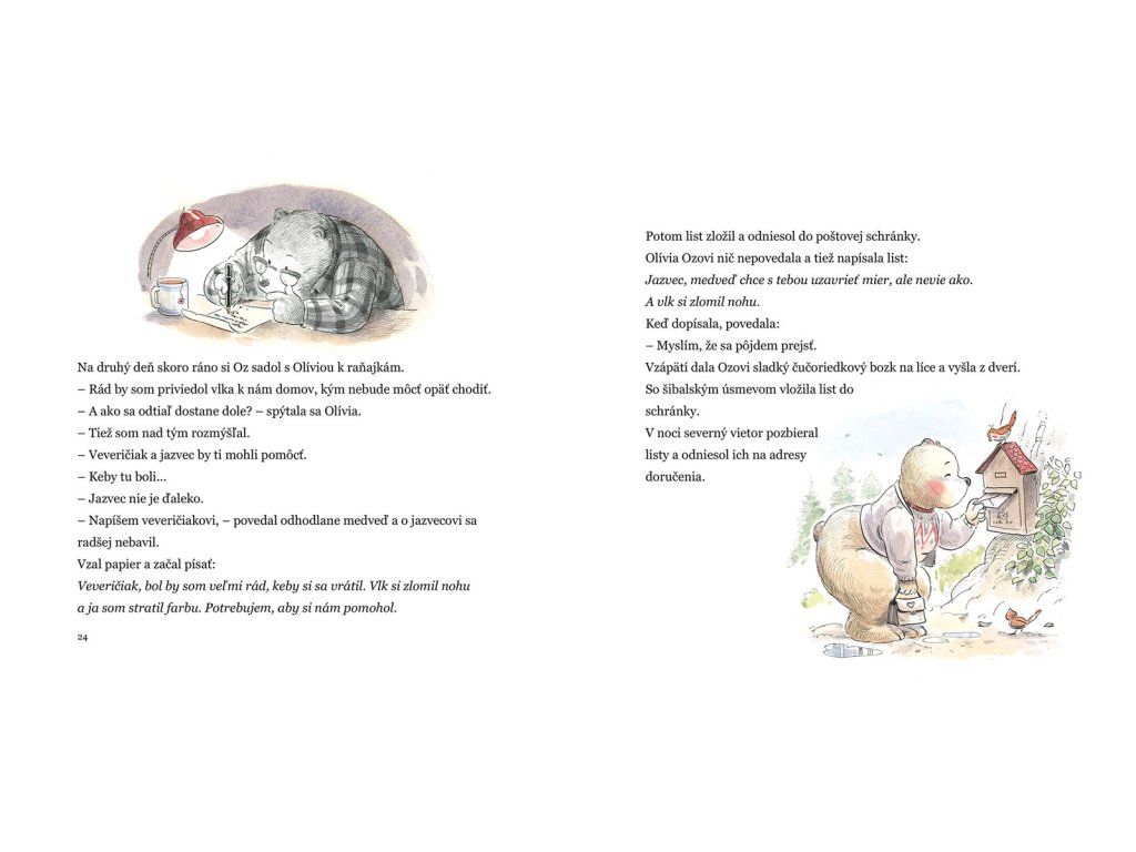 Vlčie modré tajomstvo Keď farby miznú a tajomstvá vyplávajúPríbeh štyroch zvieracích priateľov pokračuje v knihe Vlčie modré tajomstvo, ktorá prináša nové dobrodružstvá aj nečakané skúšky. Medveď Oz tentoraz hľadá svoju stratenú farbu, no zároveň bojuje s vlastným hnevom voči jazvecovi, ktorého odmieta požiadať o pomoc. Medzitým sa veveričiak túla svetom, akoby niečo hľadal, a vlk sa ocitá v ťažkej situácii – so zlomenou nohou a tajomstvom, ktoré si necháva len pre seba.Každý z priateľov musí čeliť svojim obavám, slabostiam aj rozhodnutiam, ktoré preveria ich vzťahy. Príbeh je plný napätia, dobrodružstva a láskavého humoru, no zároveň citlivo rozpráva o priateľstve, láske, odpustení a odvahe priznať si pravdu. Vlčie modré tajomstvo je rozprávka, ktorá zahreje pri srdci a pripomenie, aké dôležité je stáť pri sebe – aj vtedy, keď je to najťažšie.Dodatočné parametre