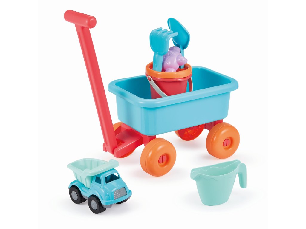 Ľahko ovládateľný vozík s otočnou rukoväťou. Vozík obsahuje vedierko do piesku s priemerom 12 cm so sitkom. Súčasťou je lopatka, hrabličky, formička na piesok, krhlička na polievanie a malé autíčko. Ideálne do pieskoviska alebo na pláž. Rozmery 69,5 x 20 x 20,5 cm.