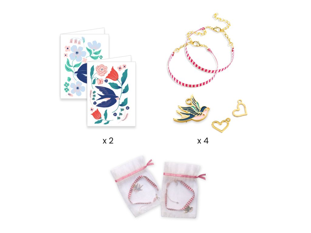 Vtáčiky na stužkách: 2 náramky stužkové s príveskamiFarebné náramky s motívom vtáčikov pre detiVtáčiky na stužkách sú krásne dva textilné náramky s farebnými stužkovými príveskami s motívmi vtáčikov, ktoré potešia každé dieťa. Náramky sú ľahko nastaviteľné a pohodlné na nosenie, takže ich deti môžu nosiť každý deň ako štýlový doplnok alebo darček pre kamošku.Prečo si vybrať náramky od Djecovhodné pre deti od 6 rokovdva náramky s veselými vtáčími príveskamijemné, ľahké a pohodlné na nosenieskvelý módny doplnok aj darčekvhodné na každodenné nosenie aj špeciálne príležitostiObsah balenia2 textilné náramky4 prívesky (2 vtáčiky a 2 malé srdiečka)2 vrecúška2 malé ilustrované gratulačné kartyobrázkový návodDodatočné parametre