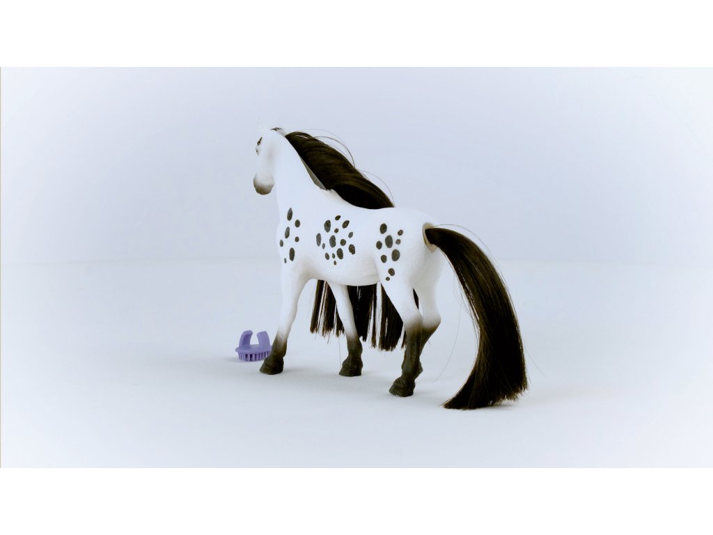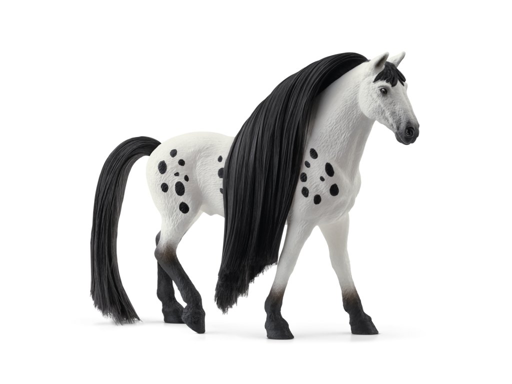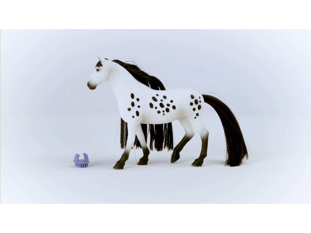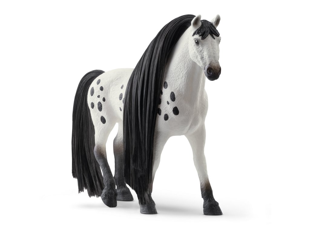 Nevypadá nádherně? Výstavní knabstrupský hřebec přitahuje veškerou pozornost svou krásně skvrnitou srstí. To ale není všechno. Jeho ocas a hříva jsou extrémně dlouhé a bujné. Naštěstí má u sebe vždy hřeben na prst, aby si mohl dlouhou hřívu vyčesat tak, aby se leskla jako hedvábí. Co si má s hřívou udělat dnes? Co takhle nějaký složitý pletený účes, nebo jen několik jednoduchých copánků? Každopádně pár korálků do hřívy nebo mašle se nikdy neztratí. Rozměry: 19x15x6cm. Vhodné pro děti od 3 let.Dodatočné parametre