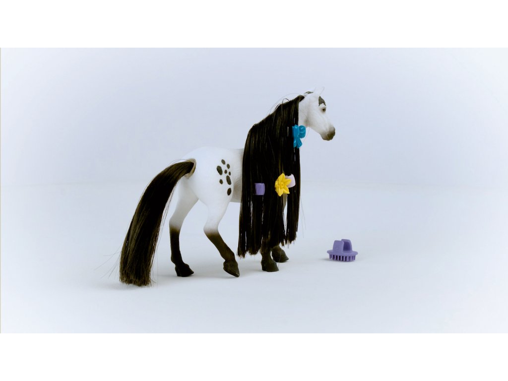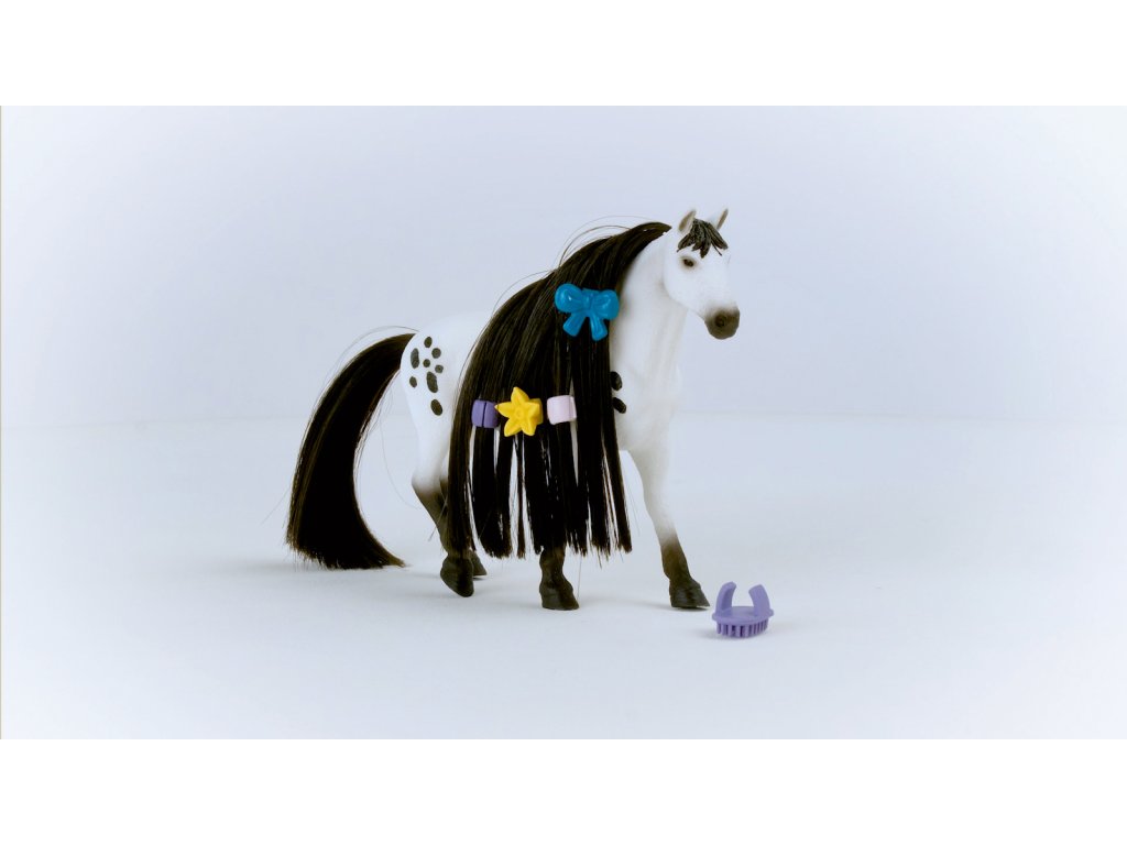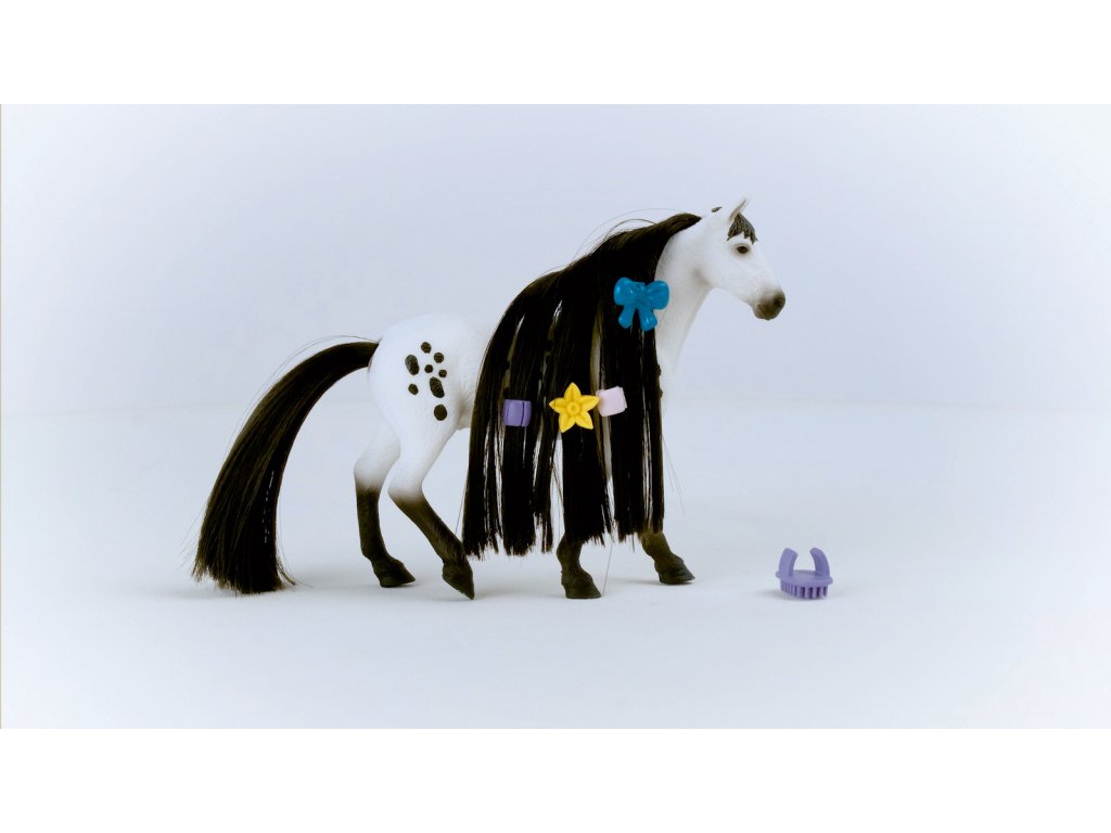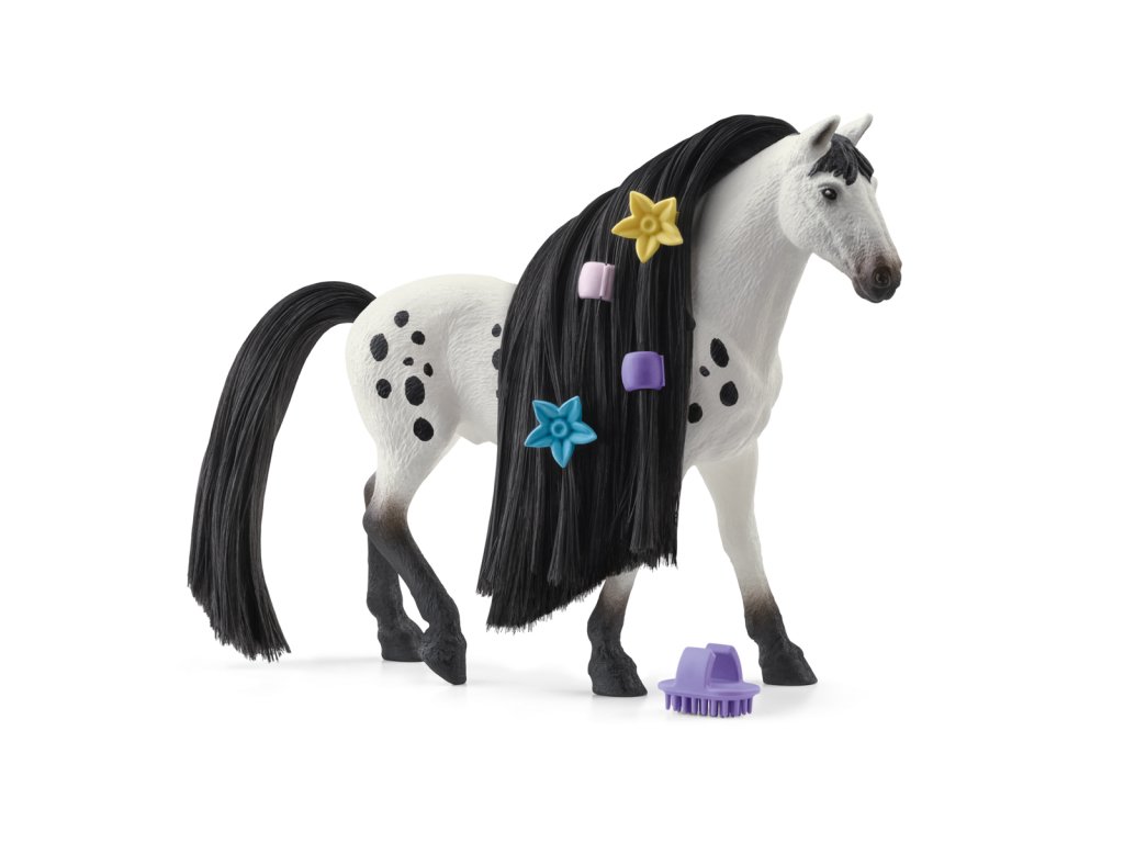 Nevypadá nádherně? Výstavní knabstrupský hřebec přitahuje veškerou pozornost svou krásně skvrnitou srstí. To ale není všechno. Jeho ocas a hříva jsou extrémně dlouhé a bujné. Naštěstí má u sebe vždy hřeben na prst, aby si mohl dlouhou hřívu vyčesat tak, aby se leskla jako hedvábí. Co si má s hřívou udělat dnes? Co takhle nějaký složitý pletený účes, nebo jen několik jednoduchých copánků? Každopádně pár korálků do hřívy nebo mašle se nikdy neztratí. Rozměry: 19x15x6cm. Vhodné pro děti od 3 let.Dodatočné parametre