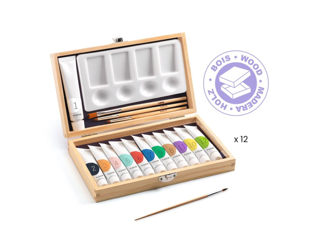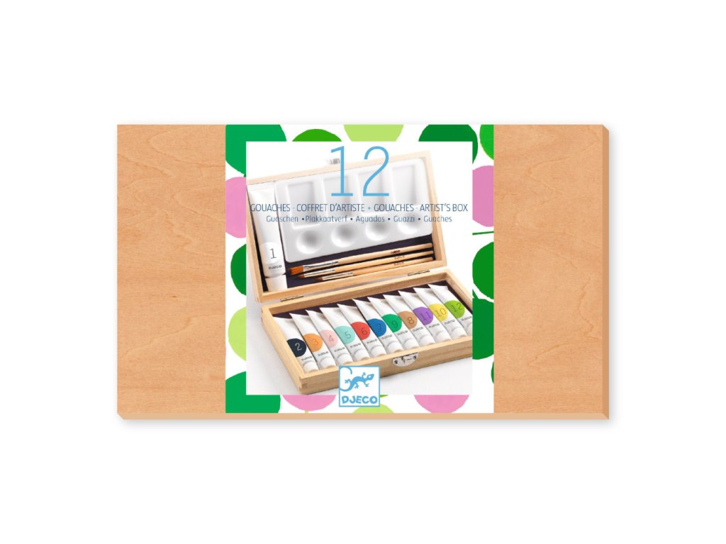 Výtvarný umelecký kufrík - gvašové farby 12ks Má vaše dieťa z výtvarných aktivít radosť? Ak áno, doprajte mu kvalitné výtvarné potreby a poteší sa ešte viac! Výtvarný kufrík obsahuje 12 kvalitných gvašových farieb v tube: 11 rôznych farieb a bielu. K tomu 3 štetce a plastovú paletku na dávkovanie a miešanie farieb. Farby majú vysokú pigmentáciu, sú výrazné. Zároveň sú zmyteľné a prateľné.S touto sadou má dieťa potreby na maľovanie úhľadne na jednom mieste. Kufrík je vyrobený z dreva s ekologickým certifikátom FSC®.Obsah: 1 kufrík s výtvarnými potrebami: 11 gvašových farieb v tube 12 ml, 1 biela gvašová farba v tube 18 ml, 3 štetce, 1 plastová paletka.Dodatočné parametre