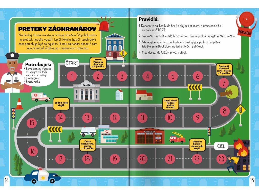 Záchranári - Aktivity so samolepkami Priprav sa do akcie a na záchranu životov s 300 samolepkami a vytláčacími modelmi. Táto kniha plná aktivít s veľkým množstvom samolepiek ti zaručí veľa zábavy, ale objavíš aj niečo nové! Na každej stránke na teba čaká mnoho úloh a výziev!Deti si precvičia jemnú motoriku a koordináciu oka i ruky. Zapoj sa do policajnej naháňačky, vyfarbuj a objavuj časti hasičského vozidla, vyrieš zákernú spájačku alebo pomôž uhasiť požiar. Súčasťou knižky je viac ako 300 samolepiek aj malé vytláčacie modely hasičského vozidla a sanitky, s ktorými si užiješ nie jednu akciu či záchrannú misiu. Hurá do akcie!Dodatočné parametre