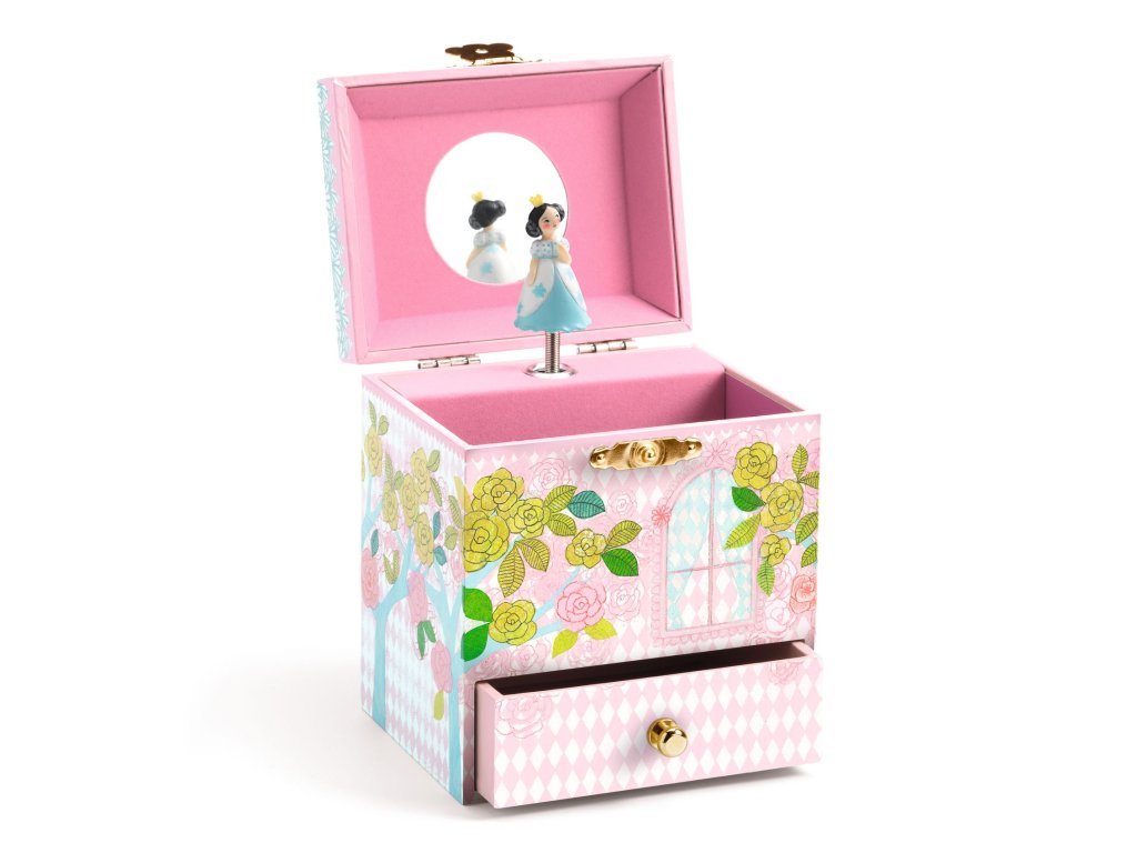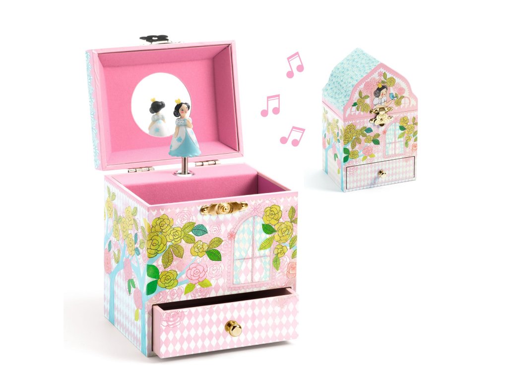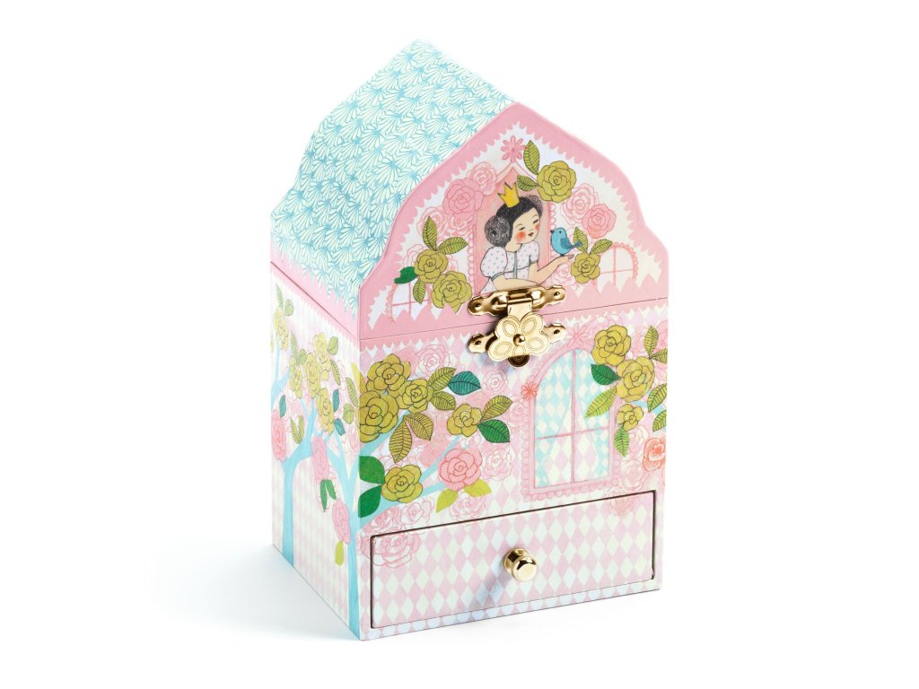 Zámoček: hracia skrinka so zásuvkouKrásna drevená hudobná skrinka s úložným priestoromZámoček – hracia skrinka so zásuvkou je dekoratívna a hravá drevená hudobná skrinka od Djeco v tvare rozprávkového zámočka, ktorá poteší deti aj ako doplnok izby. Po natiahnutí mechanizmu a otvorení veka sa spustí krásna melódia Čarovná flauta (W. A. Mozart).Prečo si vybrať skrinku od Djecovhodná pre deti od 4 rokovjemná hudba pri natiahnutí mechanizmu (cca 2,5 min)točiaca sa figúrka princeznej a zrkadielko vo vnútri2 úložné priestory – priečinok + zásuvka na poklady či šperkyestetický dekoratívny doplnok do detskej izbyObsah baleniadrevená hudobná skrinka v tvare zámočkaDodatočné parametre