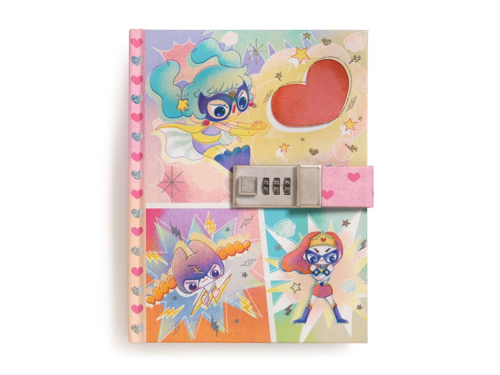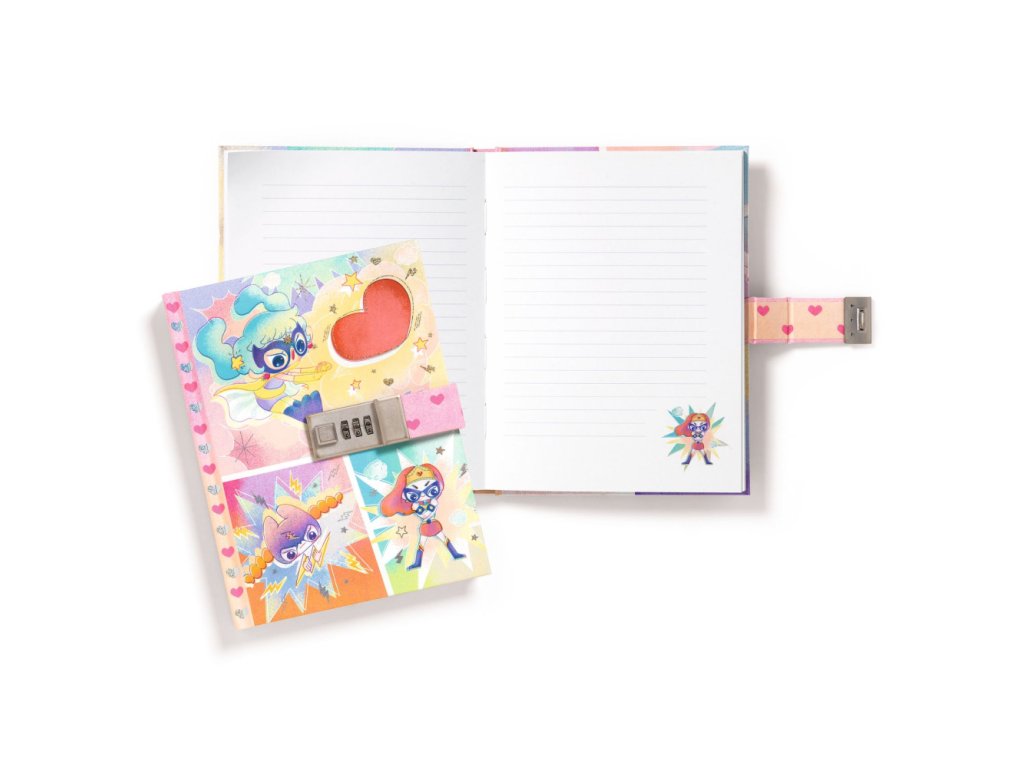 Zápisník na kód Superhrdinky Tajný zápisník s kódom na písanie denníka Čarovný detský tajný zápisník na písanie denníka z kolekcie Lovely paper. Tento zápisník má tvrdú obálku so zámkom na číselný kód, vďaka ktorému môže dieťa nastaviť vlastný trojmiestny kód a udržať svoje príbehy v bezpečí. Obálka je plnofarebne ilustrovaná superhrdinkami a ozvláštnená metalickým leskom, čo dodáva zápisníku špeciálny vzhľad. Kvalitný detský diár s ekologickým certifikátom Zápisník obsahuje 88 linajkových strán s vysokou gramážou 120 gsm, čo je viac ako štandardný kancelársky papier a disponuje ekologickým certifikátom FSC®. Každá strana je zdobená malou ilustráciou, ktorá poteší každé dieťa. Tento tajný zápisník je ideálny na písanie denníka a uchovanie detských tajomstiev v bezpečí. Rozmery zápisníka sú 15 x 19,5 x 3 cm, čo ho robí praktickým a ľahko prenosným.Dodatočné parametre