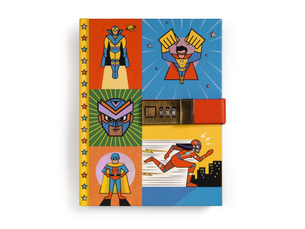Zápisník na kód Superhrdinovia Tajný zápisník s kódom na písanie denníka Štýlový detský tajný zápisník na písanie denníka z kolekcie Lovely paper. Tento zápisník má tvrdú obálku so zámkom na číselný kód, vďaka ktorému môže dieťa nastaviť vlastný trojmiestny kód a udržať svoje príbehy v bezpečí. Obálka je plnofarebne ilustrovaná superhrdinami, čo dodáva zápisníku štýlový vzhľad. Kvalitný detský diár s ekologickým certifikátom Zápisník obsahuje 88 linajkových strán s vysokou gramážou 120 gsm, čo je viac ako štandardný kancelársky papier a disponuje ekologickým certifikátom FSC®. Každá strana je zdobená malou ilustráciou, ktorá poteší každé dieťa. Tento tajný zápisník je ideálny na písanie denníka a uchovanie detských tajomstiev v bezpečí. Rozmery zápisníka sú 15 x 19,5 x 3 cm, čo ho robí praktickým a ľahko prenosným.Dodatočné parametre