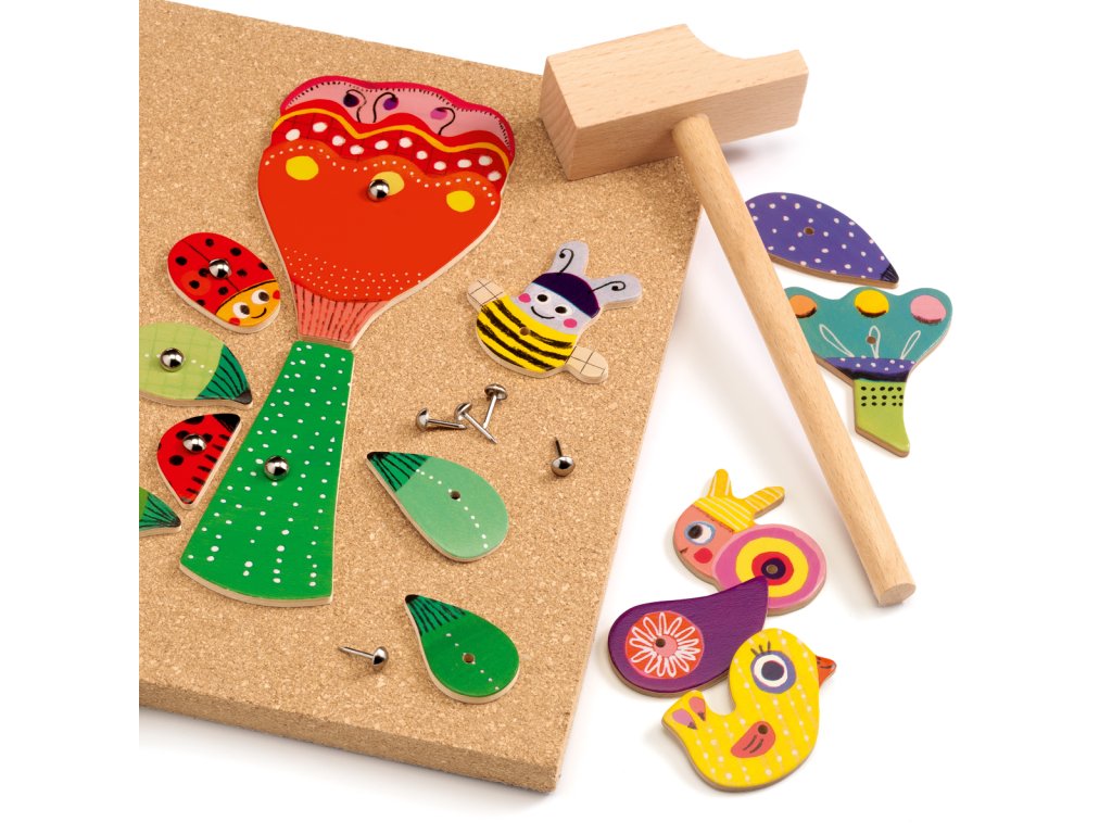 Zatĺkačka Záhrada Zatĺkaj a skladaj: tvorivé obrázky na korkovej doskeZatĺkačka Záhrada je drevená zatĺkačka, kde deti ukladajú dieliky na korkovú dosku a jemne ich pripevnia klinčekmi. Podľa predlôh vytvoria kvetiny a záhradné motívy – alebo si vymyslia vlastné.Rýchly prehľad odporúčaný vek: od 4 rokov téma: tvorenie kvetov a záhradných motívov zatĺkaním dielikov rozvíja: jemnú motoriku, koordináciu, tvorivosť a trpezlivosťPrečo si ho deti zamilujú prémiové materiály: drevené dieliky, korková doska a kladivko praktická drevená krabička s priehradkami na uloženie podporuje jemnú motoriku, koordináciu a tvorivosť možnosť skladať podľa predlôh aj úplne voľneAko sa hrá Vyberte si predlohu alebo vlastný nápad a rozložte dieliky. Umiestnite dieliky na korkovú dosku a prichyťte ich klinčekmi. Hotový obrázok si prezrite, potom klinčeky opatrne vyberte a skúste nový návrh.Obsah balenia 39× ilustrovaný drevený dielik s otvormi 40× klinček 1× korková doska 1× drevené kladivko 5× obojstranná predloha 1× drevená krabička na uloženieTechnické parametre materiál: drevo, korok, kov rozmer balenia: cca 30 × 22,5 × 3,5 cmDodatočné parametre