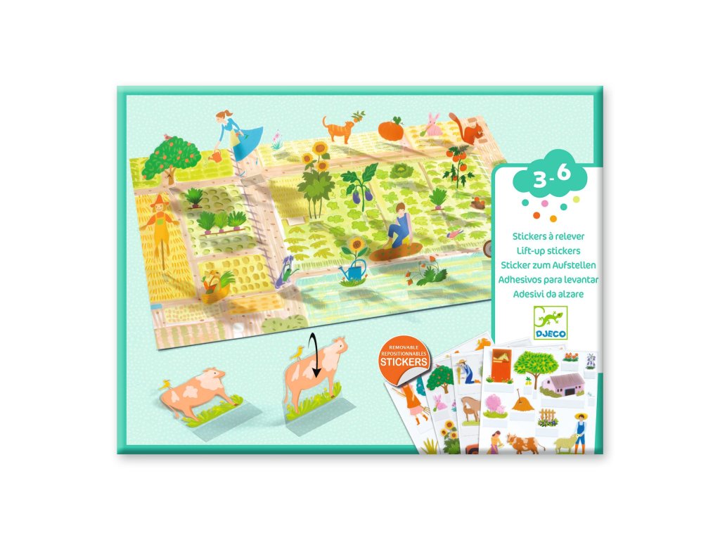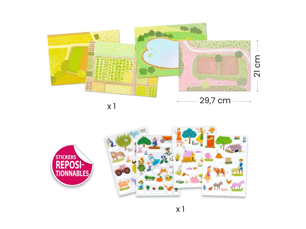 Zdvíhacie odnímateľné samolepky Farma Postav si vlastnú farmu: zdvihni samolepku a scéna ožije v 3DZdvíhacie odnímateľné samolepky – Farma sú tvorivá sada, vďaka ktorej si deti vytvoria veselé farmárske scény plné zvieratiek a detailov. Stačí nalepiť opakované použiteľné samolepky na veľké ilustrované pozadia a potom ich jednu po druhej zdvíhať – vzniká tak hravý 3D efekt, ktorý deti motivuje objavovať a vymýšľať príbehy.Samolepky sa dajú odlepovať a znovu nalepovať, takže farma môže vyzerať zakaždým inak: raz sú zvieratká pri stodole, inokedy na lúke či pri jazierku.Pre koho je vhodná: odporúčaný vek: 3 – 6 rokovHlavné benefity inovatívne samolepky so zdvíhacím efektom – scény pôsobia priestorovo opakované použitie – dieťa môže scénu stále meniť podporuje fantáziu a tvorbu vlastných príbehov rozvíja jemnú motoriku a koordináciu oko–ruka 4 veľké pozadia – veľa možností na nové kombinácie vyrobené z papiera a kartónu s FSC® certifikáciouObsah balenia 4 veľké ilustrované pozadia na dotváranie (cca 21 × 30 cm) takmer 80 opakovane použiteľných zdvíhacích samolepiekDodatočné parametre