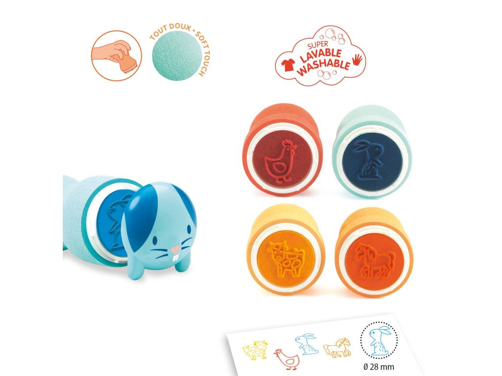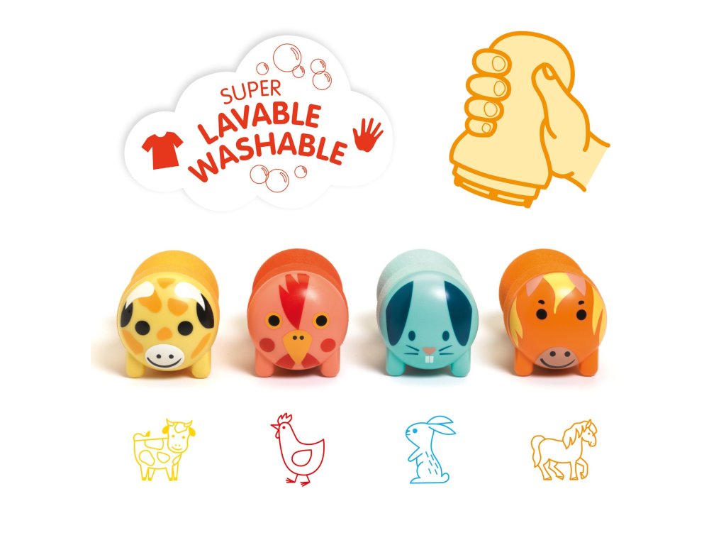 Zvieratká z gazdovstva: Samonamáčacie pečiatky pre drobcovPrvé kreatívne pečiatky pre najmenších – jednoduché, čisté a zábavné pečiatkovanieKreatívna sada Zvieratká z gazdovstva: Samonamáčacie pečiatky pre drobcov od značky Djeco je ideálnym úvodom do sveta tvorenia pre najmenšie deti. Vďaka jednoduchému samonamáčaciemu systému dokážu deti pečiatkovať úplne samostatne – bez podušky, bez neporiadku a bez pomoci dospelých. Stačí vziať do ruky pečiatku, pritlačiť ju na papier a farebný odtlačok zvieratka je hotový. Táto sada je skvelá pre prvé zoznámenie s výtvarnou činnosťou. Vďaka ergonomickým držadlám padnú pečiatky presne do malých detských rúk a podporujú prirodzený rozvoj motorických zručností. Deti si tak hravou formou vytvárajú vlastné obrázky so zvieratkami z gazdovstva – kravičku, sliepočku, koníka či králika.Čo všetko si deti vytvoria:Pečiatkujú prvé obrázky zvieratiekKombinujú farby a tvaryDotvárajú vlastné obrázky pastelkami či fixkamiObsah balenia:4 ergonomické samonamáčacie pečiatky (každá s vlastným farebným atramentom):Žltá kravaČervená sliepkaModrý zajacOranžový kôňPečiatky fungujú na princípe „zatlačiť a otlačiť“, takže sú ideálne pre malé deti približne od 18 mesiacov.Čo si deti pri tvorení rozvíjajú:Jemnú motoriku a koordináciu oko–ruka pri presnom tlačení pečiatokVizuálne vnímanie farieb a tvarovTrpezlivosť a sústredenie pri umiestňovaní pečiatokPrvé príbehové myslenie, keď skladajú scénky so zvieratkamiPrečo si vybrať túto kreatívnu sadu od Djeco:Navrhnuté špeciálne pre malé detské rukyFarba je zabudovaná v pečiatke – žiadny neporiadok ani potreba poduškyŽiarivé farby atramentu a krásne ilustrácieIdeálne ako prvá kreatívna aktivita pre malé detiKvalitné materiály a dizajn typické pre DjecoSkvelý darček pre deti od 18 mesiacovDodatočné parametre